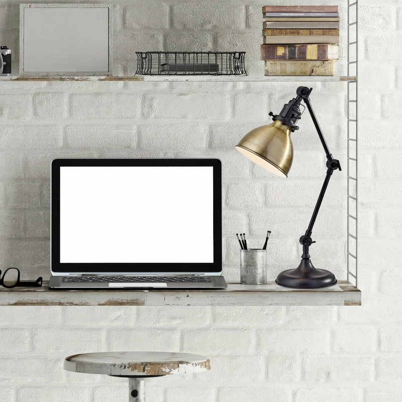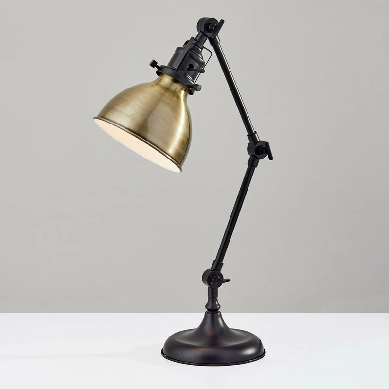 Light up your workspace in style with this Desk Lamp. Industrial detailing on the shade cup and joints elevate this classic task silhouette. A dark bronze finish provides a beautiful contrast to a warm antique brass finished metal shade. With three adjustable joints, it is easy to direct the light exactly where it is needed.
