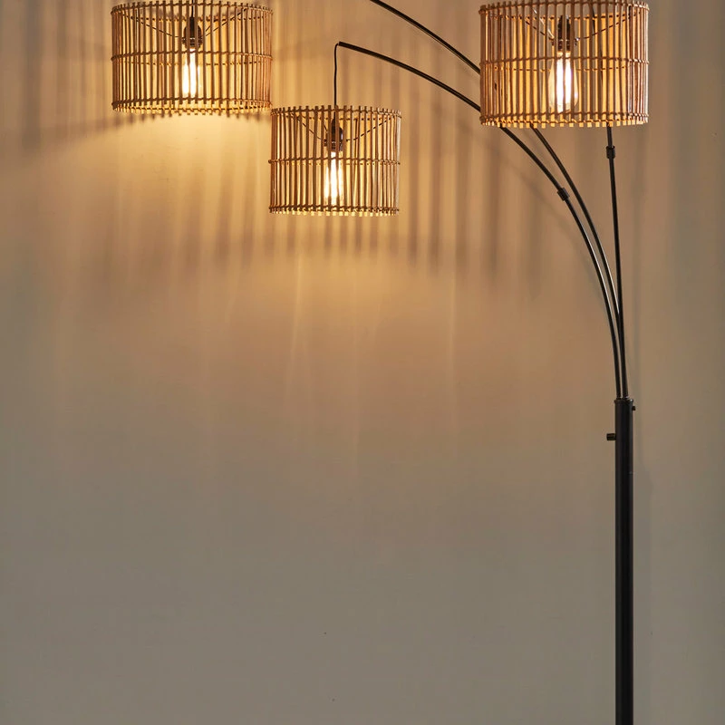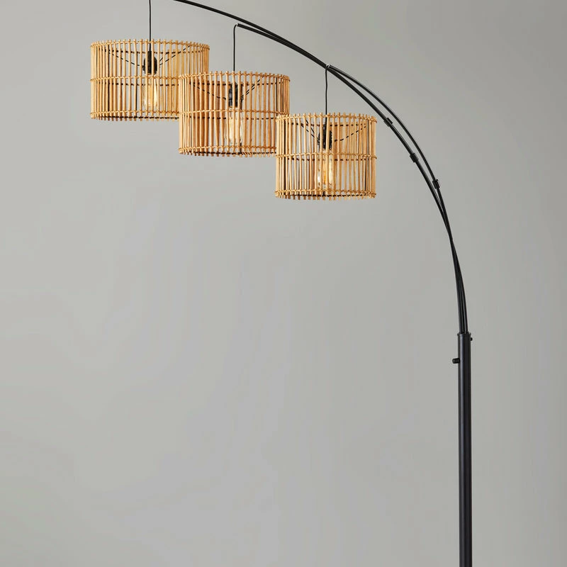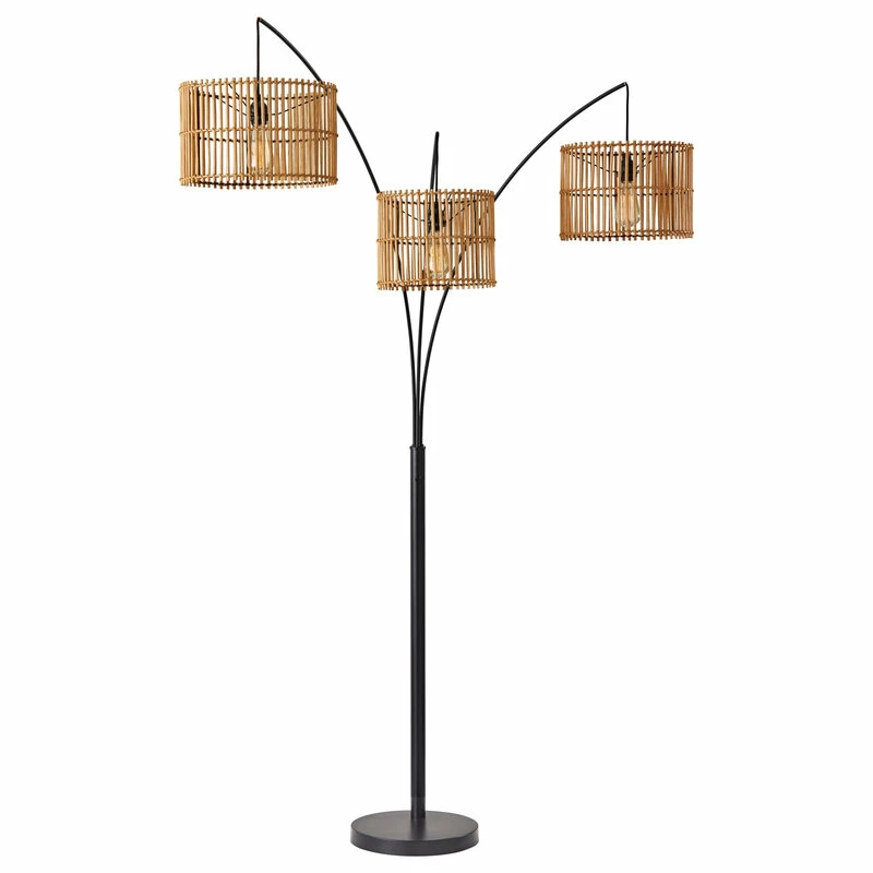 The Cabana Arc Lamp is a simple silhouette with design focused on the natural beauty of the materials. Natural rattan sticks are diligently lined up forming three shade frames that each house a 60W amber tinted decorative vintage bulb, which come included with this item. The arching body is made up of a dark bronze finished metal. Set this 3-arm arc lamp next to the sofa to add some functional, bohemian flare to your living room. Adjust the light with a simple rotary switch on the pole allows for multiple settings: 1 light on, 2 lights on, 3 lights on, off.