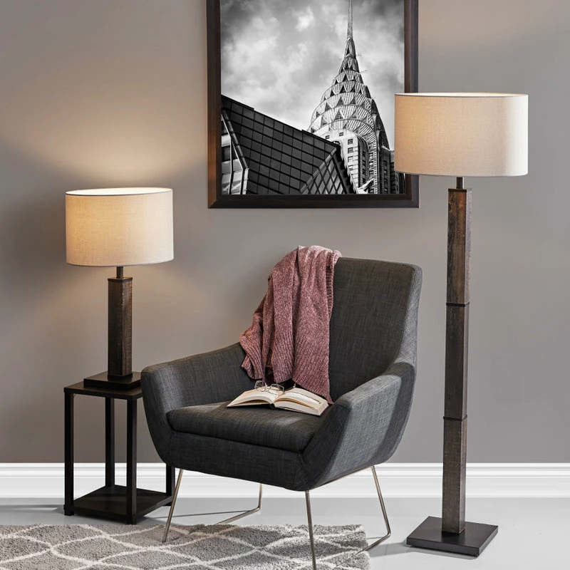 A modern take on rustic charm, the Kona Floor Lamp can elevate the look of your bedroom or living area. A reclaimed wood finish is mixed with black metals and a textured light grey fabric shade, creating a style that can fit perfectly into industrial or farmhouse inspired homes. With a 61″ height and a 2.5″ thick square pole, this lamp is a substantial piece of decor as well as a functional source of ambient lighting. A 3-way rotary socket witch controls a bulb up to 150W or an equivalent CFL. The 3-way rotary socket switch will only work with a 3-way light bulb, otherwise this lamp will function with simple on/off switch at its highest setting. All Adesso lighting product is either UL or ETL listed, meaning that it has been tested and approved to meet the government-regulated safety standards for the USA. Bulb is not included.