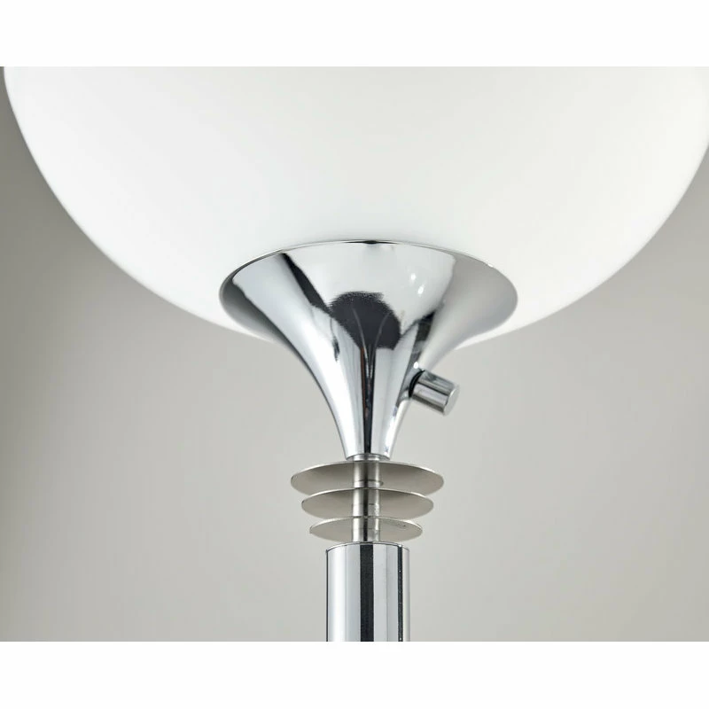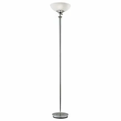 The Metropolis Floor Lamp is a sleek, contemporary style with a dramatic brushed steel finish and elegant frosted glass bowl shade. An Adesso patented 300 Watt Double Socket construction allows for two crisscrossed sockets, each holding on/off 150 Watt incandescent or LED bulbs which provides approximately 3 times more light than a typical torchiere. A simple high/low rotary switch is located on the shade cup to adjust the brightness. This lamp has a black cord and is smart outlet compatible. Bulbs are not included. Use incandescent bulbs up to 150W or dimmable led bulbs (DO NOT USE: 3-way bulbs or CFL’s)