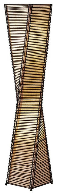 The frame of the Stix lamp is a twisting black metal tower. On either side of each corner a thin vertical cane rod is connected to the frame top and bottom. Thin black cane sticks are stacked and woven, resulting in the appearance of a stick tower. The shade is lined with a fabric-like beige paper and the lamp has ball feet at corners.