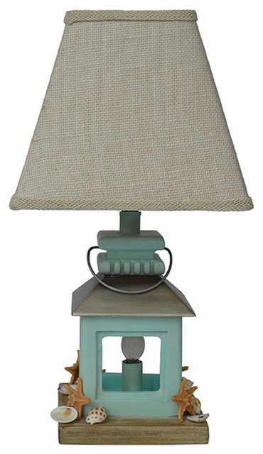 Light up your living space! This lovely lamp features a lantern base with a beige linen shade and coastal accents. Its design makes it ideal alongside beach style decor. One 40-watt standard bulb is required (not included), and it has an on/off switch.