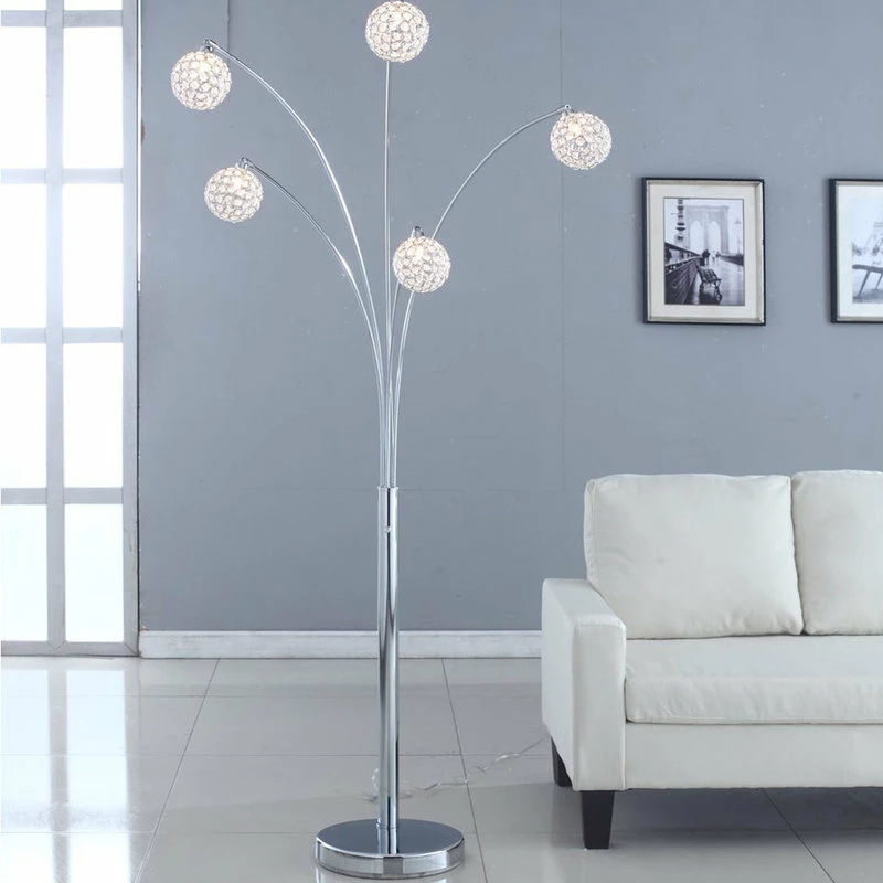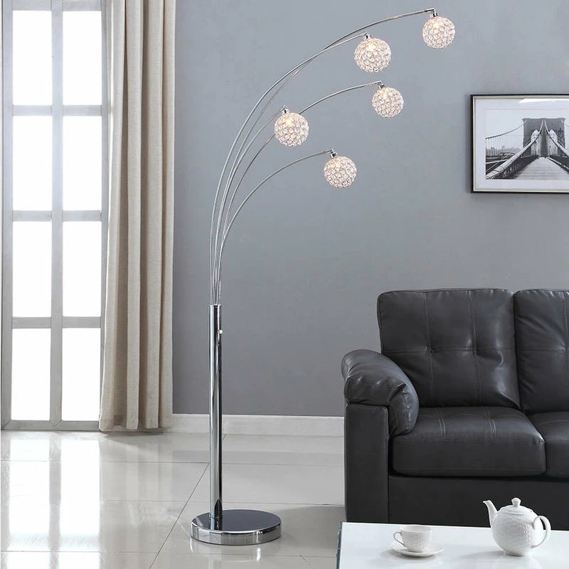 Light up your living room, bedroom or office with the “Manhattan” Modern chrome 5-Arch crystal balls floor lamp form Artiva USA. Its clear handcrafted crystal balls shine beautifully in the light, providing a warm and inviting tone to any room. This lamp is perfect addition to your home. Its features on adjustable Arch that allows you to spread the light apart.
