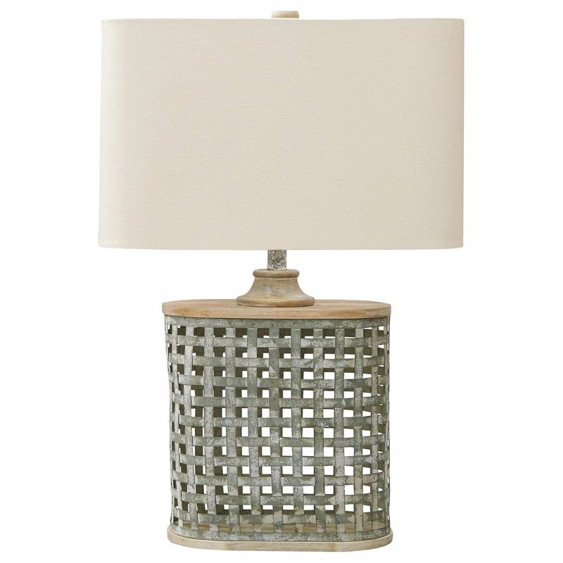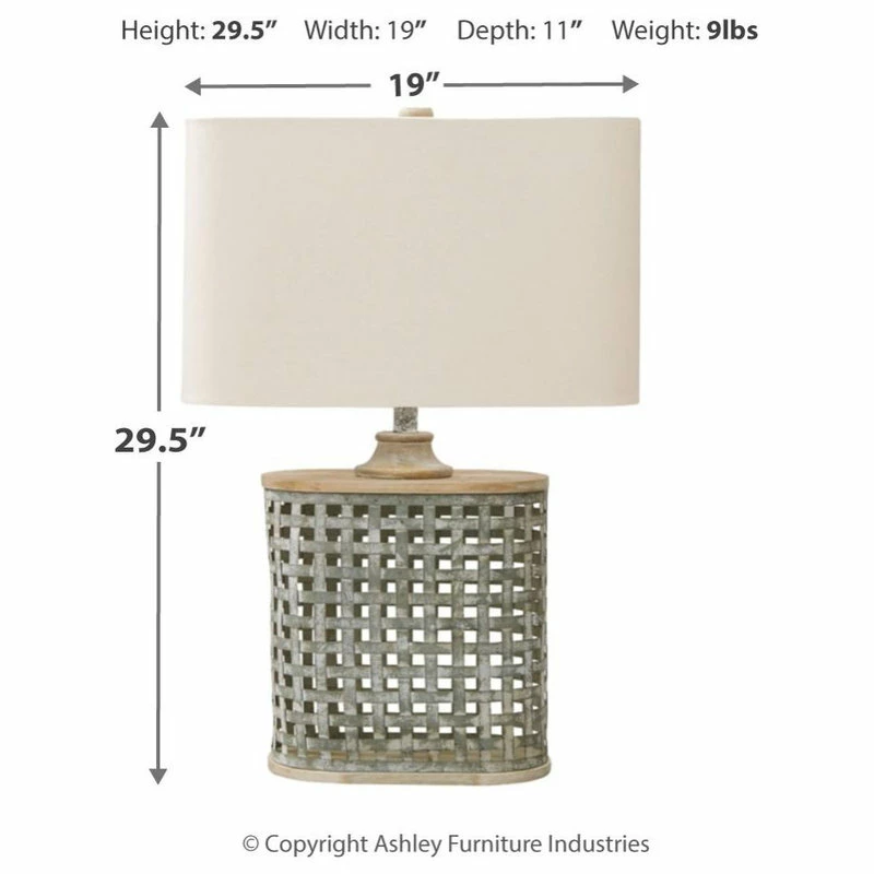 Whether your look is coolly contemporary or retro chic, this neutral table lamp simply delights. Whitewashed finish over galvanized metal adds the perfect rustic refined tone. The shapely base, placed next to a sofa or beside a bed, rounds out the look beautifully. Signature Design by AshleyοΏ½ is a Registered Trademark of Ashley Furniture Industries, Inc.