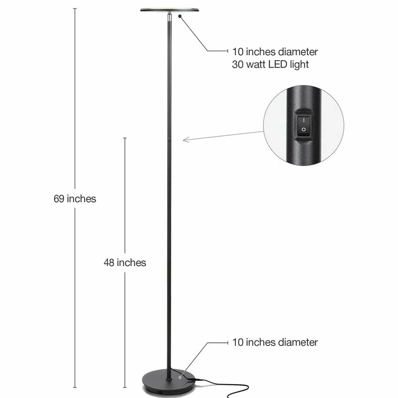 SLENDER FREE STANDING UPLIGHT = GREAT IN A LIVING ROOM CORNER, IN A CORNER OR BEDROOM: Minimalist body lets this lamp slide even into tight corners or behind couches / sectionals. Rotating head pivots light up, down, or side-to-side. Flat top is easy to clean. Stands 5’9″ tall; power cord extends just over 7 1/2 feet. Sturdy, felt-covered base bottom won’t scuff floors; stable 13-pound weight averts tipping over