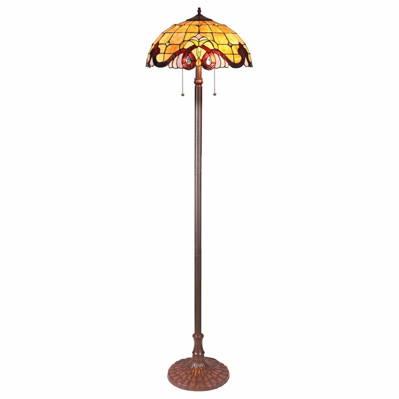 ANNA, a Victorian style 2 light floor lamp features a simplex yet beautiful design with a dark bronze finish. This piece is handcrafted from over 190 pieces of hand cut, stained art glass, 9 colorful glass beads and 18 glass crystals, with a vibrant orange as the main color. Handcrafted using the same techniques that were developed by Louis Comfort Tiffany in the early 1900s, this beautiful Tiffany-style piece contains hand-cut pieces of stained glass, each wrapped in fine copper foil.