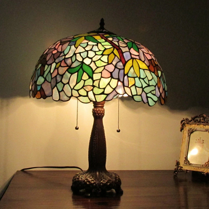 PHOEBE is a Wisteria table lamp with a multi-color Wisteria shade and a tree-like footed base. Expertly handcrafted with top quality materials including real stained glass, casting a rainbow of color when lit. The resin base is finished in an antique bronze patina.