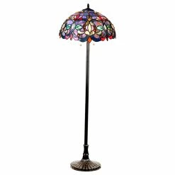 This Tiffany style 1-light floor lamp features a dark antique bronze finish that will complement many decors throughout your home. Hand crafted from over 450 pieces of art glass and 66 beads that will add color and beauty to any space. Main colors are purple, blue, red, and green. Handcrafted using the same techniques that were developed by Louis Comfort Tiffany in the early 1900s, this beautiful Tiffany-style piece contains hand-cut pieces of stained glass, each wrapped in fine copper foil.