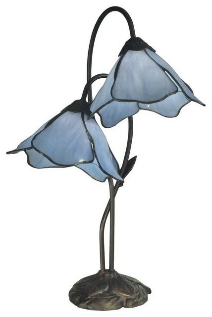 Our Poleking series of table lamps is an easy way to add unique color and charm to any room of your home. This 2 light lily lamp features two elegant lily blossoms in shimmery pink art glass. Each of the 5 panels on each shade feature fluid, graceful edges that faithfully recreate 2 delicate lily blossoms. The shades hang from 2 gracefully curved stems flowing from an intricately carved metal base, which is finished dark antique bronze. A perfect choice for a boudoir or powder room, this charming lamp is will provide your family with years of beautiful, reliable lighting.