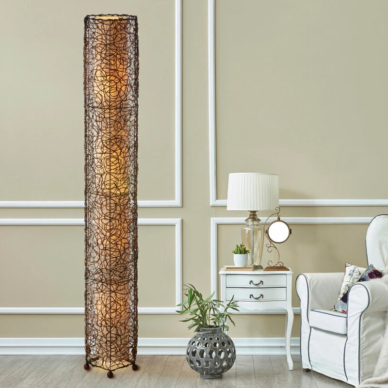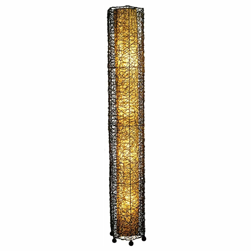 The inner diffuser features banana fiber which is adhered using a non-toxic adhesive to a standard UL lamp backing. The outer diffuser features nito vine woven into a sturdy, wire mesh that is attached to a wrought iron powder-coated frame. The entire lamp is set on wooden finials.