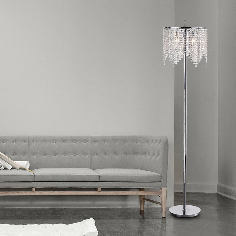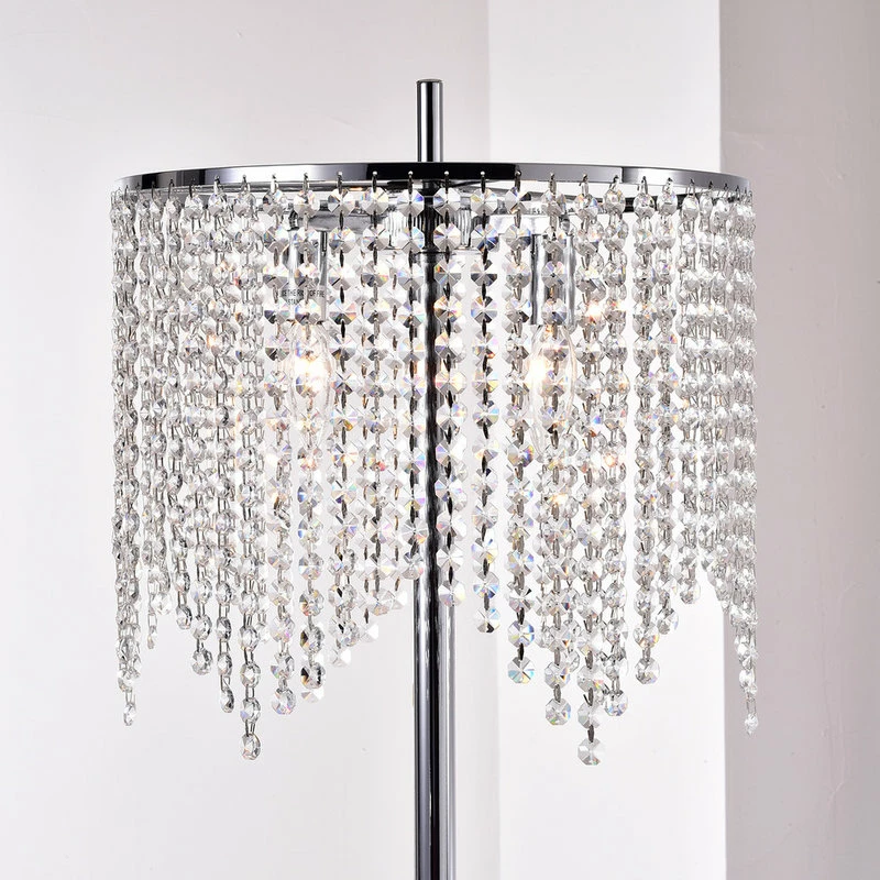 This beautifully opulent floor lamp is a perfect addition to any room, it features a chrome and crystal latticed lamp shade accented by an internal layer of crystals that surround the 3 lights. The crystals and shade filter the light into the room, it is a low glow of light that does not overwhelm but definitely does not disappoint. It measures at 5.4 feet and its ample size and style will make it a staple for any room that needs drama and a touch of mood lighting.