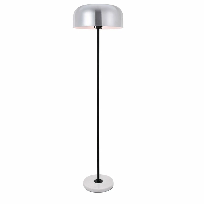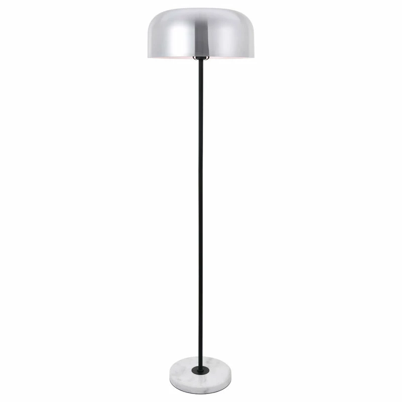 - Contemporary brushed nickel finish floor lamp with a dome shape shade, slender body, and white Carrera marble base