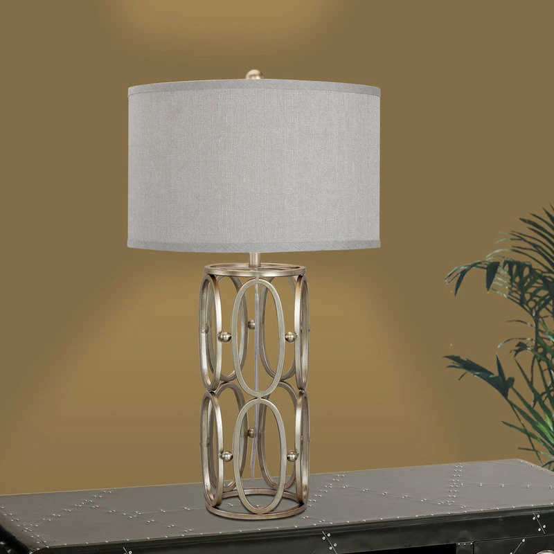 Fangio Lighting’s # 1512 28″ Champagne Gold metal circle tower table lamp takes transitional simplicity and wonderfully pairs it with the refined elegance of Asian inspired style! If you like infusing a touch of Zen tranquility into your environment, this lamp is for you with its open air presence that adds a unique sense of space and dimension to the area around it. Throughout history the “Circle” has represented a multitude of inspirational aspects, such as the sun and moon. It even is used to symbolize ideas of infinity, wholeness and perfection. This lamp is no exception! This is not a style you will easily find elsewhere, as the light was specifically created to stand out with its own captivating flare! The instant charm this light possesses is easily appreciated, along with its complimenting designer linen shade in a decor friendly Grey hue that completes the look. The lamp also has an easy to use 3-Way switch to help you have the exact amount of light desired when you need it. Embrace your infinite decorating possibilities! Whether you love the versatility of Transitional decor or enjoy making sophisticated modern statements in your room design, this lamp is for you! (Item is UL listed and CSA approved.)