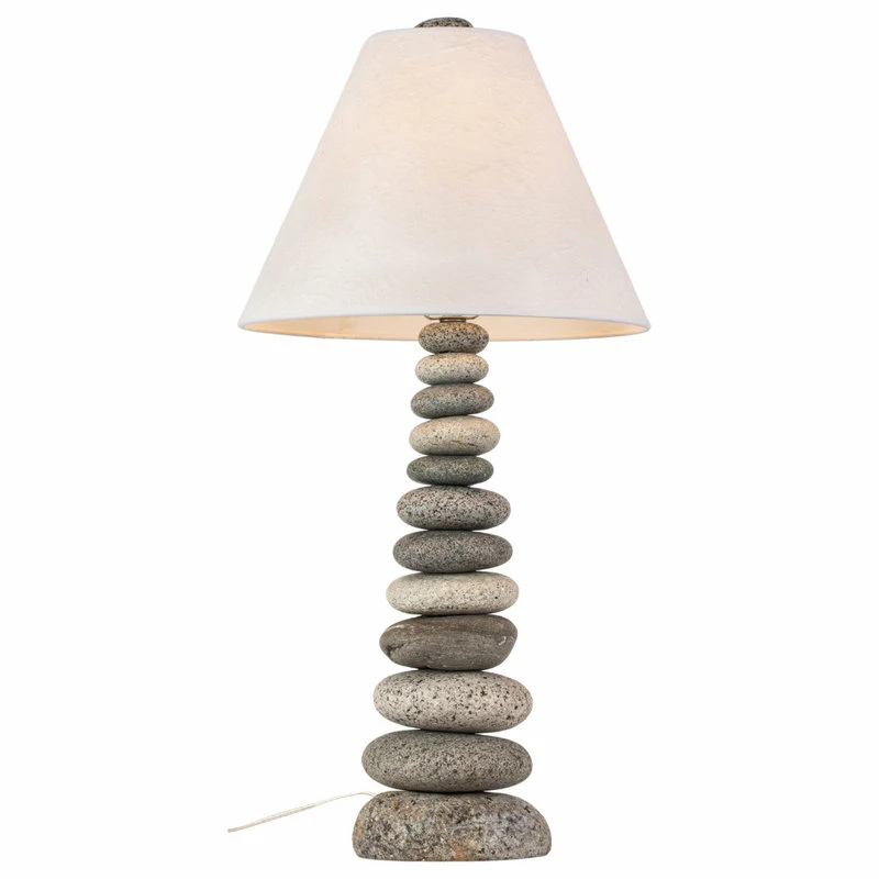 Stacked rock cairns have been used since ancient times to mark landmarks, trails and historic sites. Handcrafted from natural beach stones and river rocks, our Coastal Cottage Lamps are a handsome representation of traditional cairns found throughout New England. Each lamp is approximately 24-25″ tall with a standard on/off switch and includes a handmade paper shade, capped with a beach stone finial. Accepts up to 100 watt bulbs.