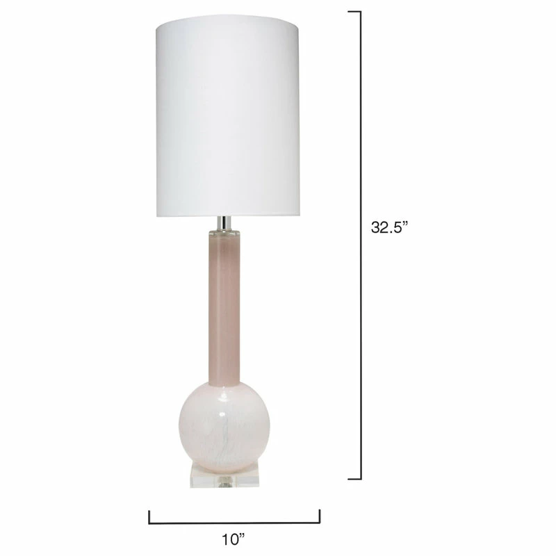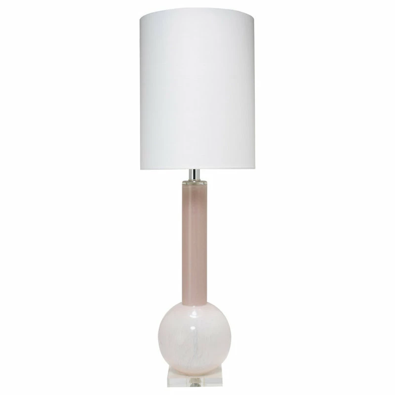A quietly modern glass lamp in a graceful petal pink glass.31.25H x 10W x 10D . Made of hand-blown glass . 100% Linen Tall Thin Drum Shade . Acrylic Base: 5″W x 5″D . Transitional, Contemporary, Mid Century Modern; Coastal; Scandinavian; Modern Style . Crafted of hand-blown glass, this lamp will feature subtle markings and variations in tone. These unique imperfections and variations are what define our products, with each piece having its own personality. .We do not recommend using harsh or abrasive cleaners at any time as they can damage product. Wipe surfaces gently with soft, dry cloth. If needed, you may use a lightly damp cloth with water only on base.