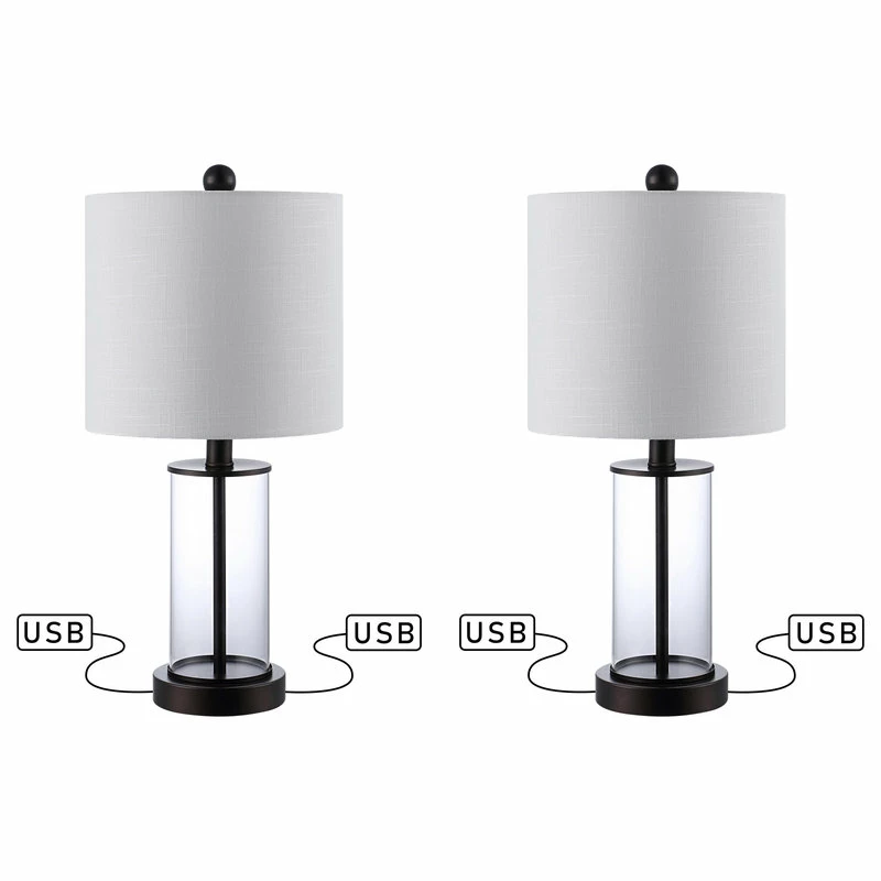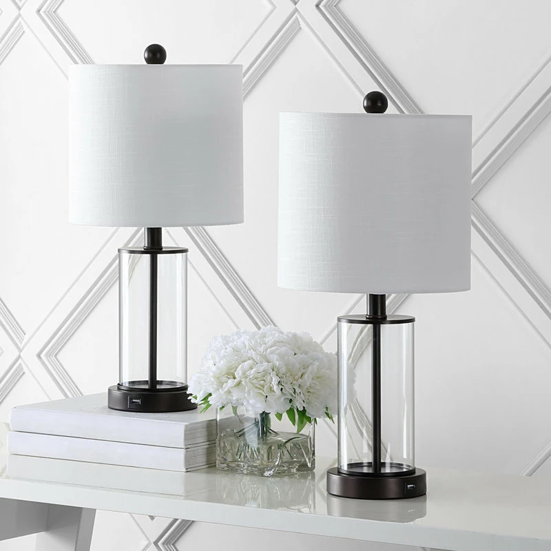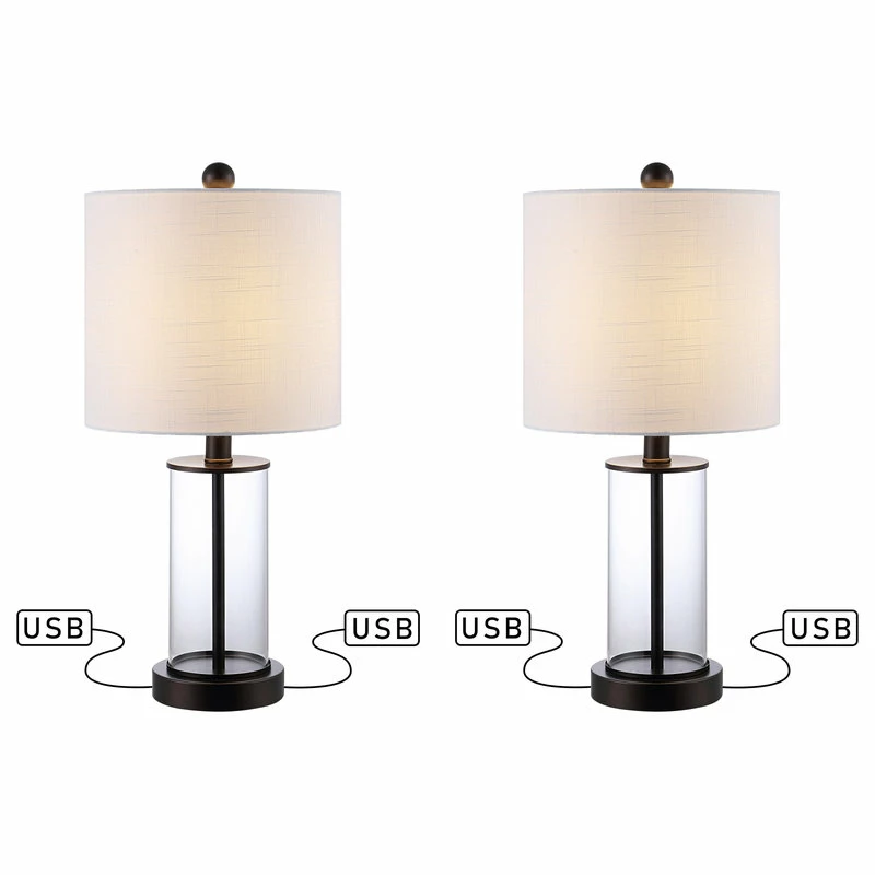 Sleek and sophisticated, this table lamp pairs a clear glass with oil rubbed bronze accents, it has two handy USB charging port too. The charging feature is ideal for vacation homes and hospitality projects. With its totally translucent base, this piece is a clear winner.