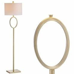 - Standard brass floor lamp base is punctuated with a stylish hoop design
