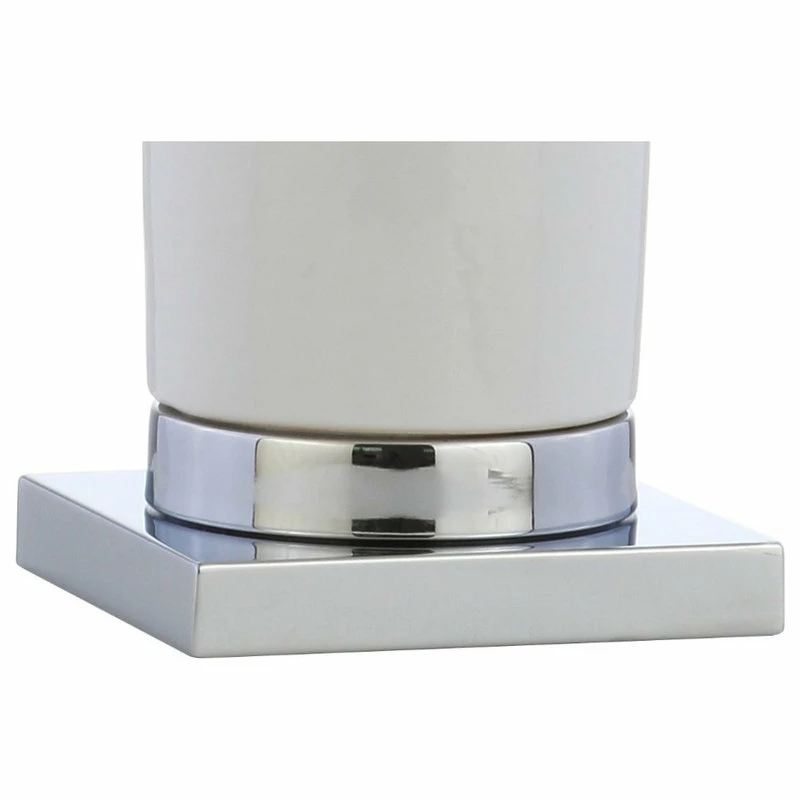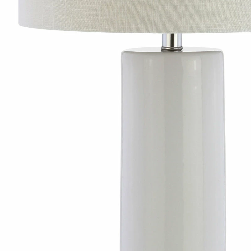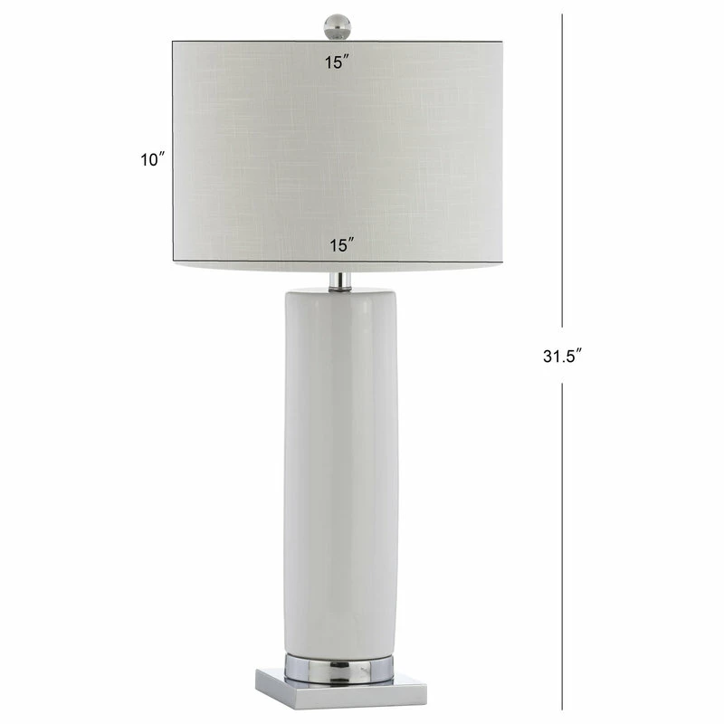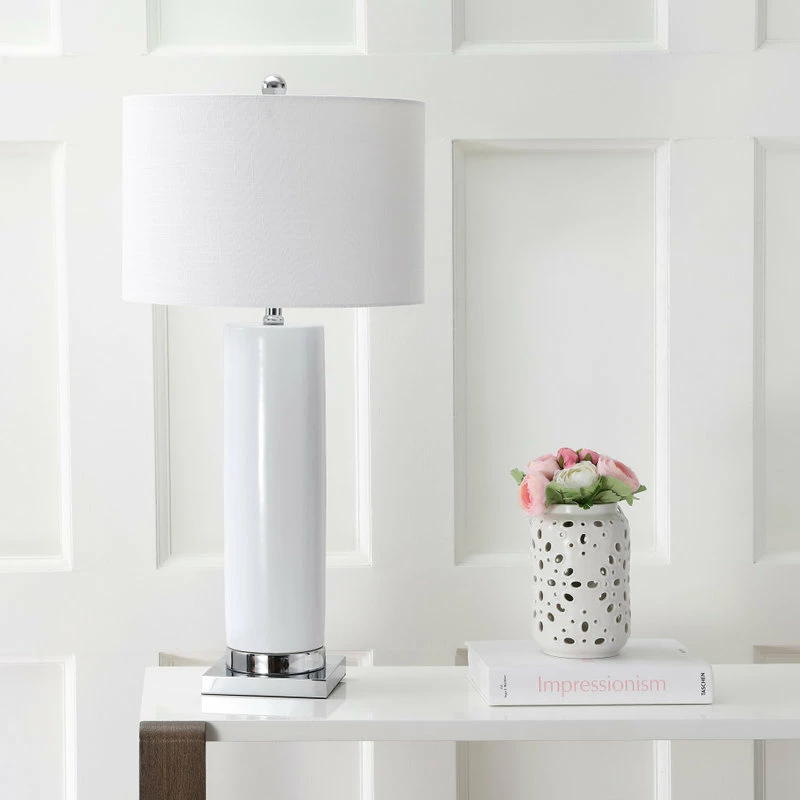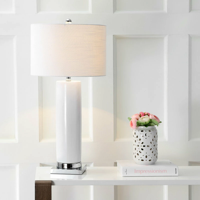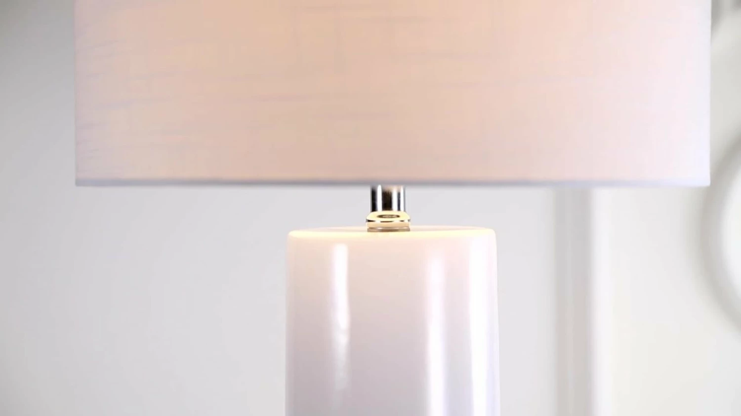 Featuring an understated column shape, this table lamp is an elegant but relaxed look to complement a living area or bedroom. In a white glazed ceramic paired with a chrome base, the designer look is completed with a white linen drum shade and silk-wrapped cord. Try displaying in pairs to add extra punch to any style of decor.