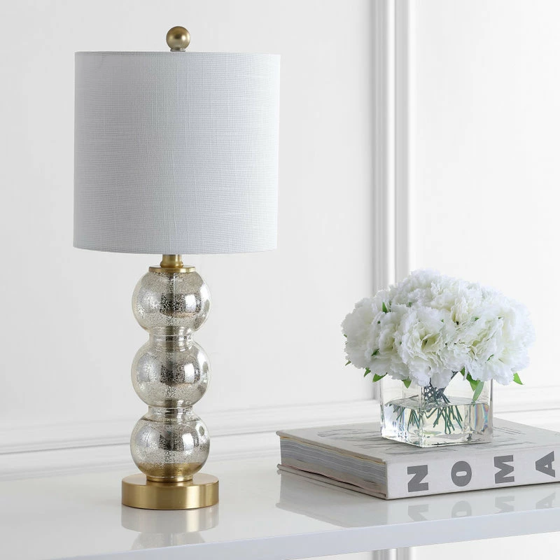 Combining a playful elegance and luxe materials, this stacked sphere glass table lamp will gracefully light any space. Taken from Art-Deco inspiration, its gracious silhouette is created by the linear geometry of three symmetrical curves, as if containing identical spheres. Finished with brass hardware, the look is both elegant and statement-making.