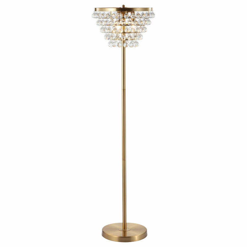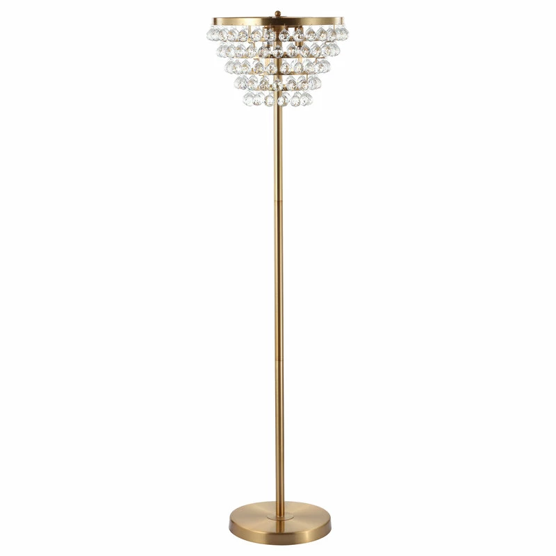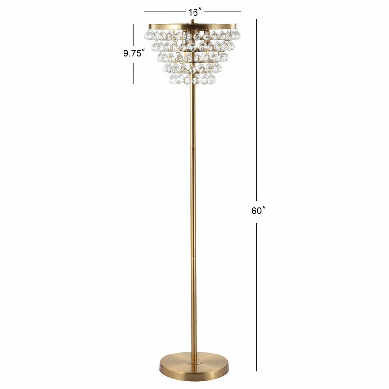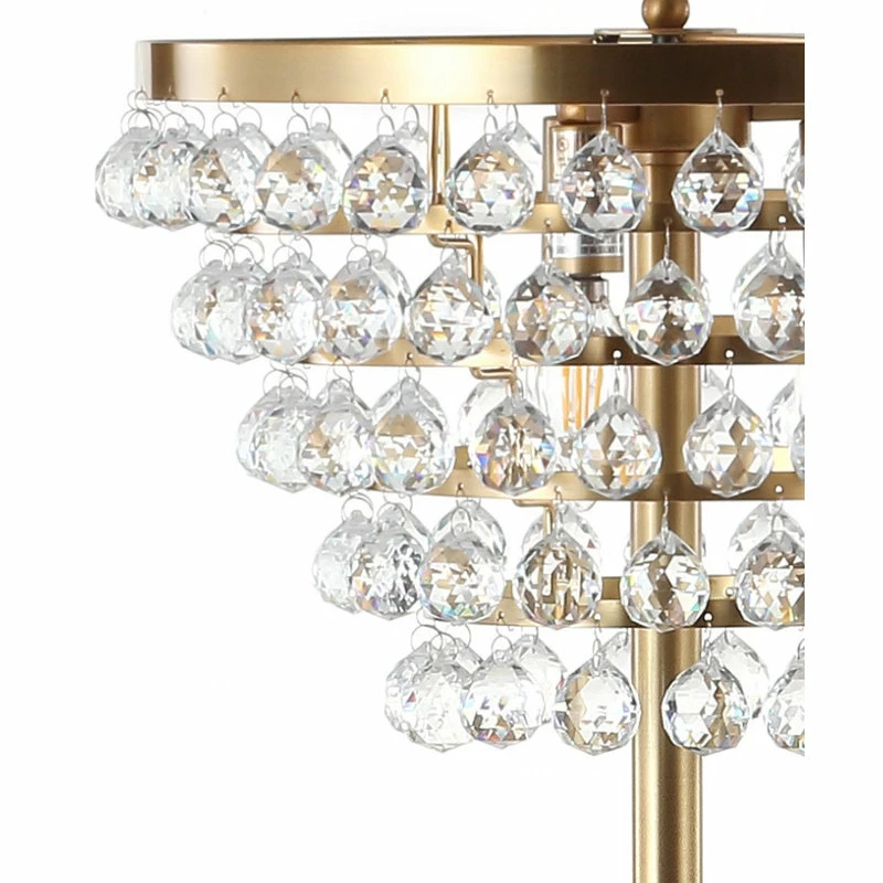 Large crystal droplets catch the light, enhancing the shimmer of this stunning floor lamp and adding timeless elegance to any room. With the shade hanging in five tiers, this floor lamp gives the effect of a chandelier without the hard-wired installation or required high ceilings. At 60″ tall, the scale is perfectly suited for a living room or bedroom.