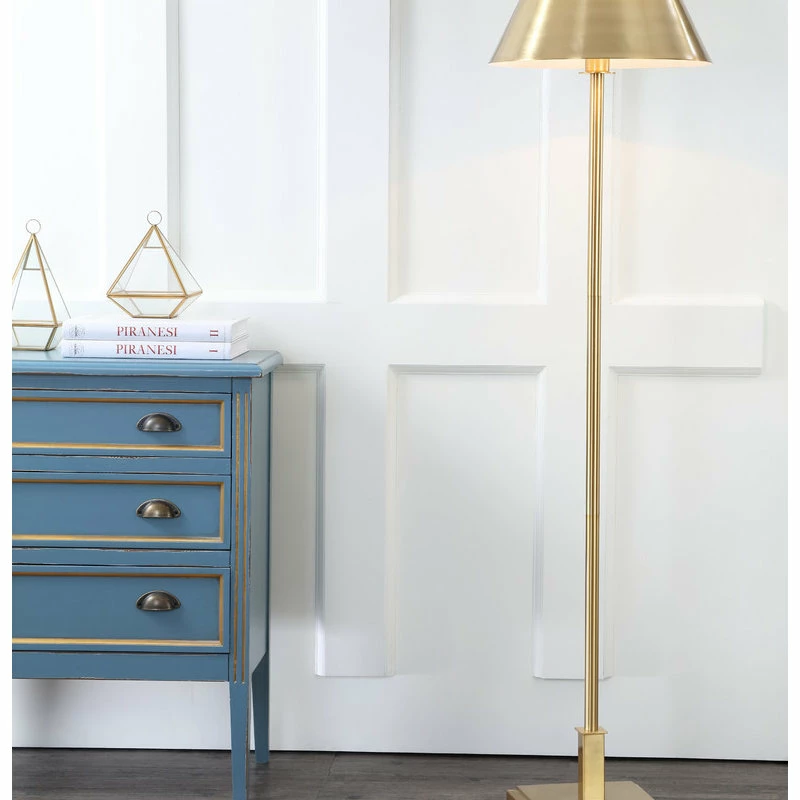 A traditional floor lamp silhouette is made modern by the addition of a brushed brass lampshade. In a classic 60″ height, perfect for beside a sofa or chair, it will easily blend in with a variety of d’cor styles. The silk-wrapped cord completes the look with elegant panache.
