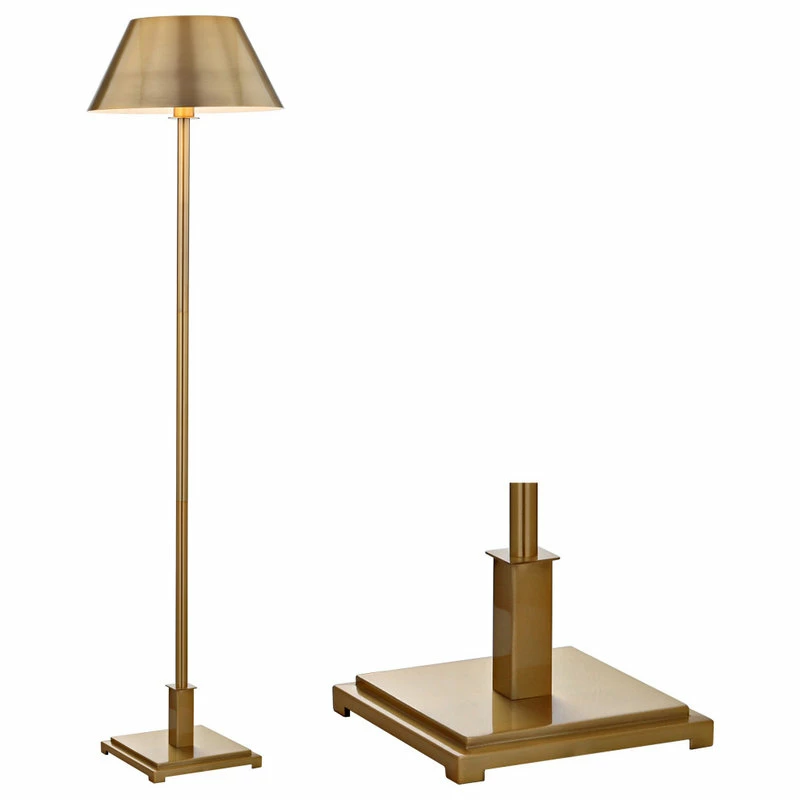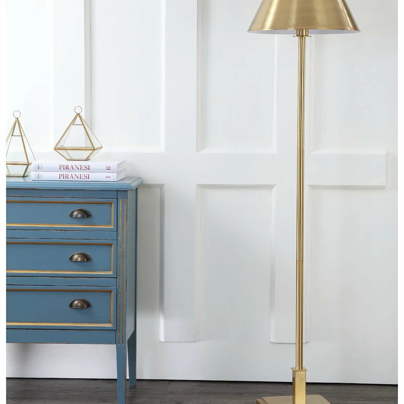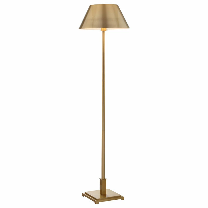 - Brushed brass lampshade and base in a classic floor lamp silhouette and scale-Brushed brass metal shade