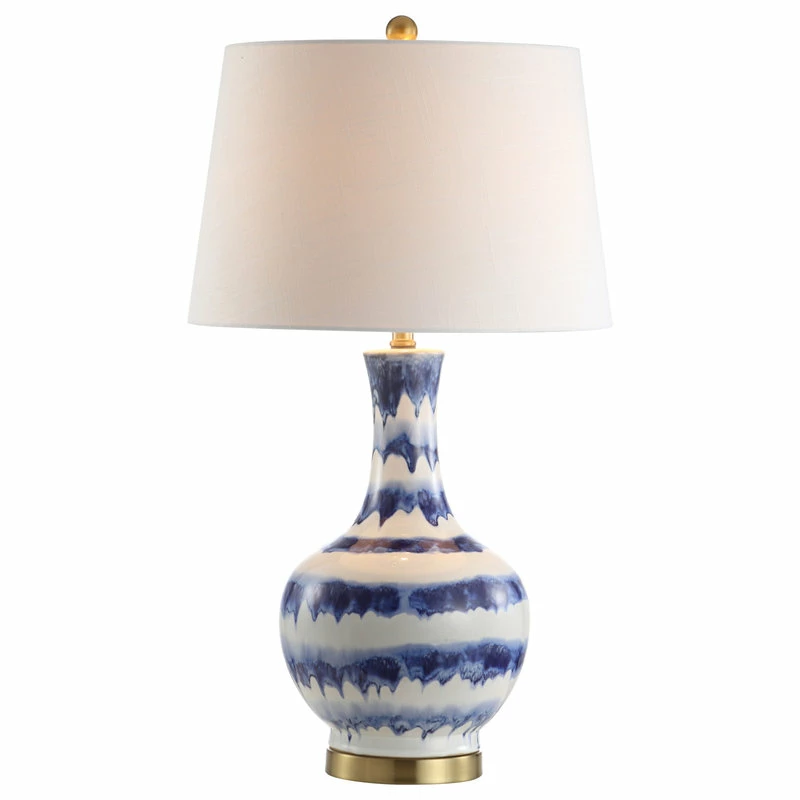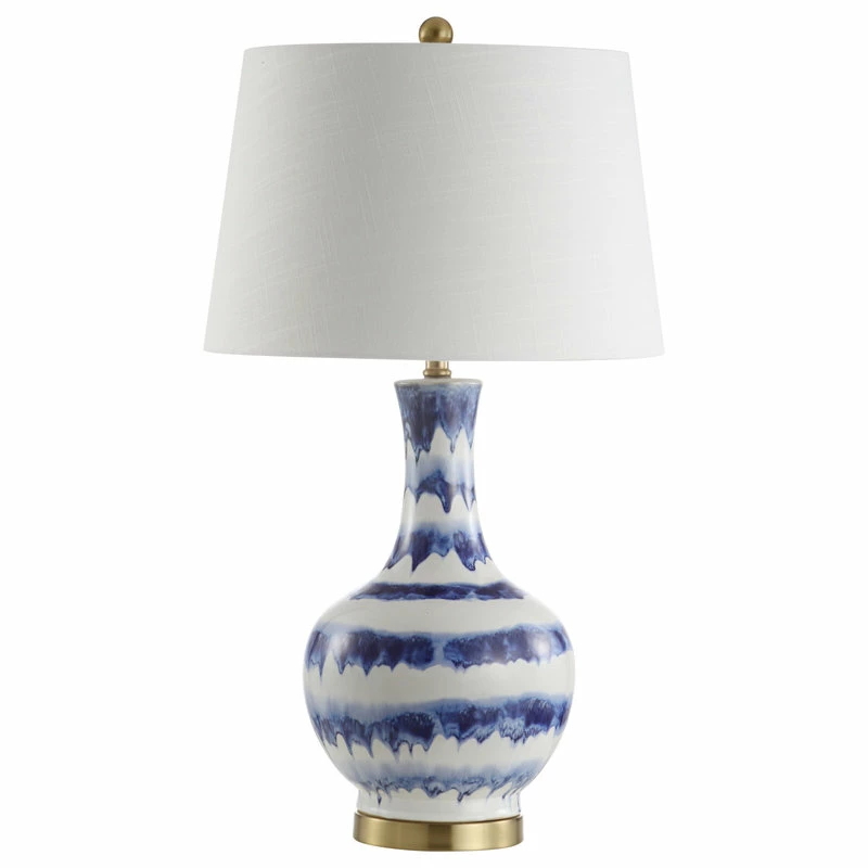 Simultaneously classic and coastal, the glaze effect on this vase lamp base looks stunning in any decor. Whether you consider blue a pop of color or a classic neutral, the modern dripped stripe coupled with a traditional shape and brass pediment make this style a versatile classic. The formal gold hue of the base is echoed in the finial and fittings, while the cotton linen tapered drum shade keeps the completed look casual enough for a cabin.