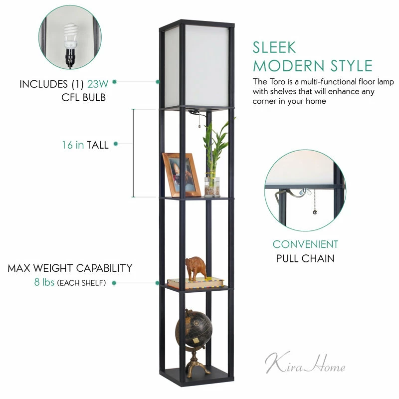 This modern floor lamp with an elegant black wood finish and a poly/cotton white shade will look great in any room of your home. The floor light is easy to operate with a pull-chain switch and has 3 shelves that provide room to display your prized possessions. The floor lamp includes (1) 23W Warm White Energy Efficient Compact Fluorescent bulb (100W incandescent replacement). Some assembly is required. While you may see many similar products from our competitors, we ensure that our products are UL listed. Ensuring that you can enjoy our products with a comfort of mind, knowing we put your safety first.