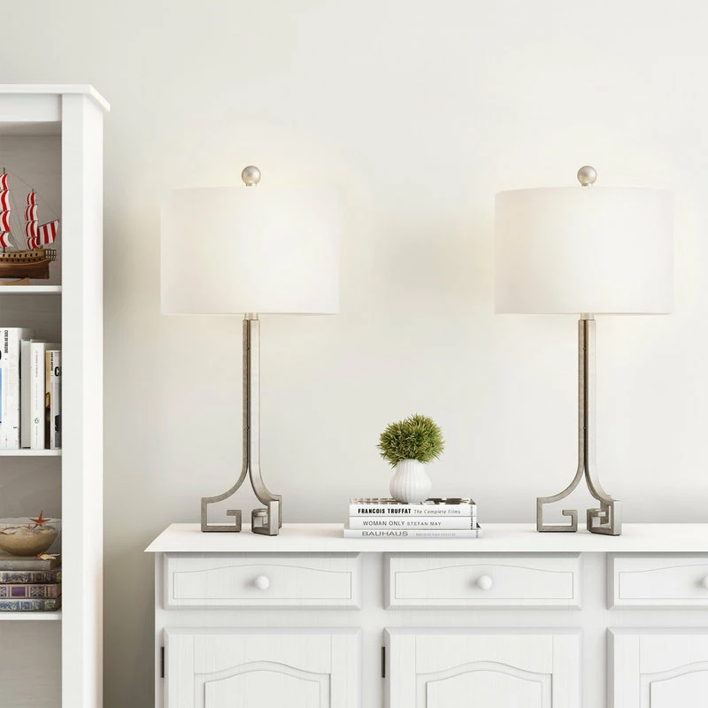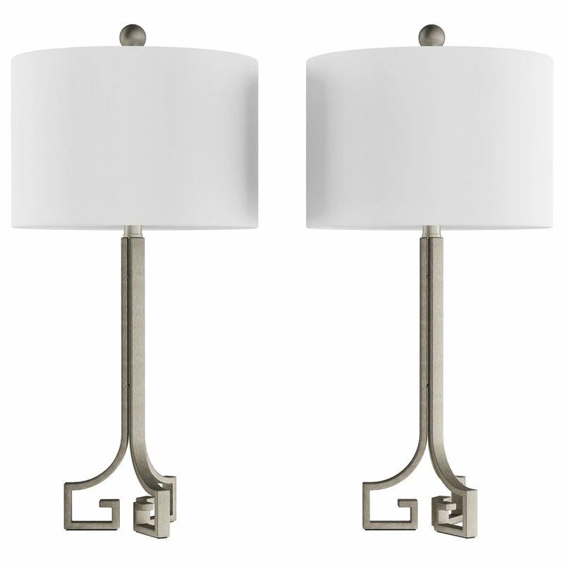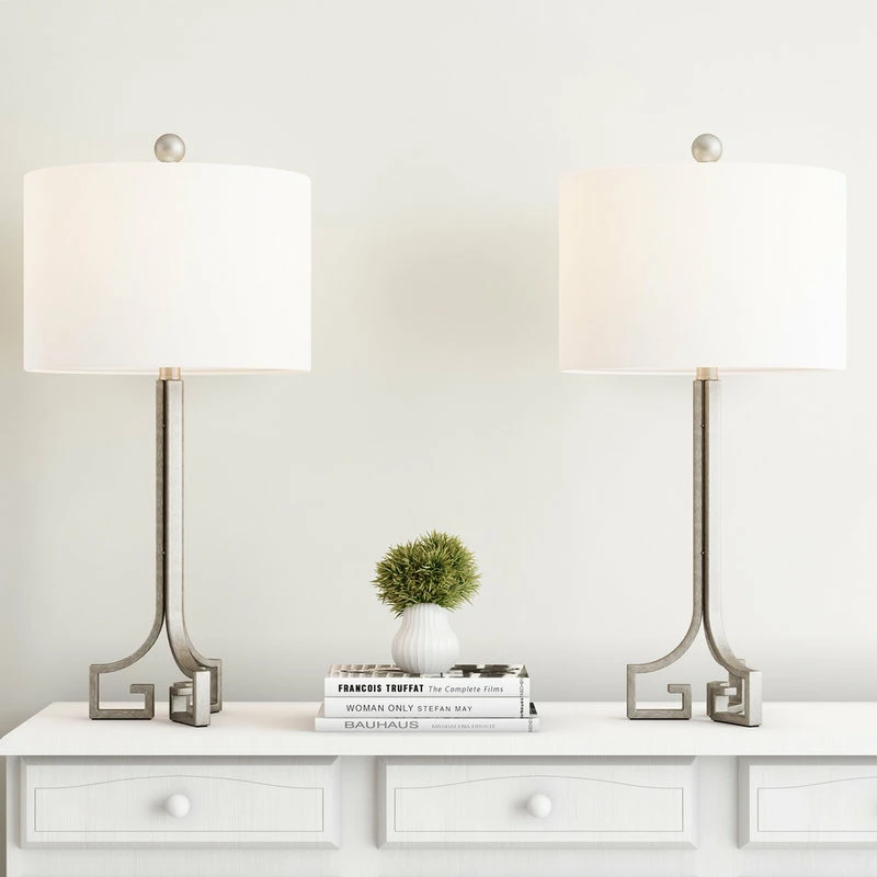 Instantly transform your space with stylish form and function, with this elegant and unique Greek Key Design Lamp Set from Lavish Home. With a beautiful yet sturdy tripod base that features an eye-catching antique silver finish metalwork design inspired by a popular symbol of friendship, love and unity, and crisp ivory shades, the lamps provide beautiful warm ambient lighting for your entryway, bedroom, living room, or home office. The UL-listed table lamps conveniently come with energy-saving replaceable ETL listed LED lightbulbs that have a 25,000-hour lifespan. Its a perfect matching 2-piece set that will add a unique and modern touch to the nightstands or end tables in any room!