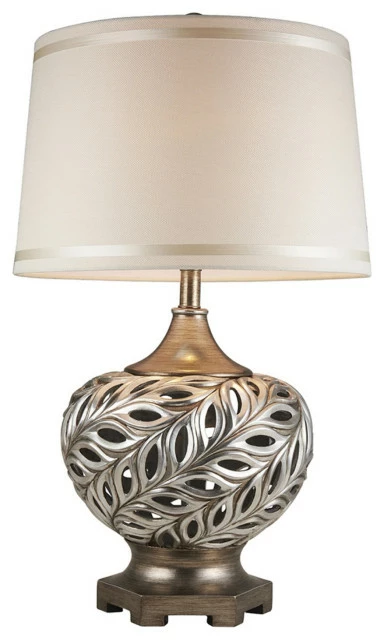 This elegant table lamp is designed to bedazzled your home decor collection that accent your passion for design and home comfort.This modernized and luxurious styled table lamp creates a unique effect to the environment and your room. The style of the lamp have a very distinctive feature, with the Peacock Feather Scroll pattern adorned around a deep silvery grey hexagon footed base. With its intricate openwork along the base and attention to detail, this table lamp caters to the transitional-minded. The savoy silver finish takes it to new stylish heights.Features