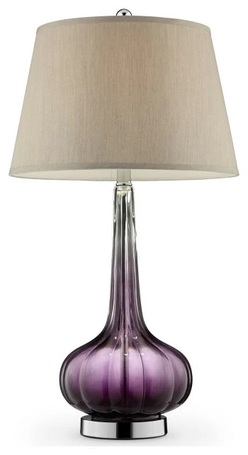 Dazzling sparkles bring the fluted mulberry base of this elegant contemporary glass table lamp beautifully to life. Elongated onion bloom details accent the base in this stunning deep Mulberry Table Lamp. The fluted art glass construction creates an eye-catching shape, topped with an Empire greysih linen lamp shade. Add glamour to any room with this fantastic lamp. This table lamp boasts a sleek and contemporary flair. Exquisite transitional style is yours with this glass table lamp.Features