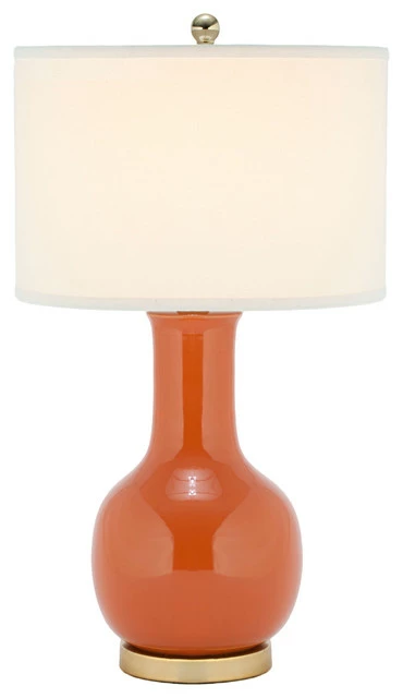 The Paris Lamp is sure to illuminate any room with elegance and style. Its classic gourd body of dark orange glazed ceramic is accented with gold-finished metal neck and base, and topped with a hard white drum shade of cotton.