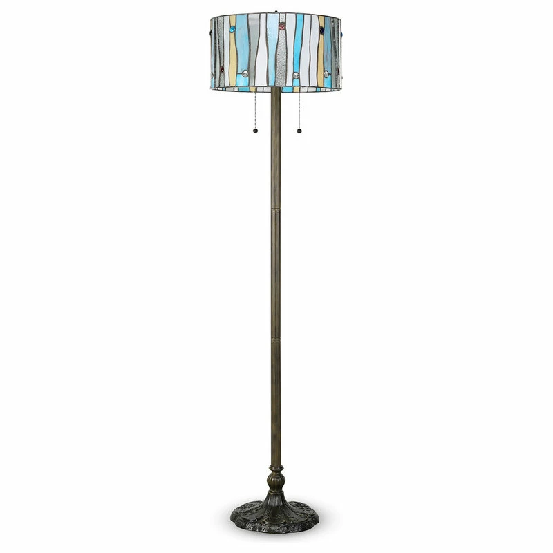 This gorgeous Contemporary Tiffany style Floor Lamp has been handcrafted in hues of blue, yellow and white to accent any modern home decor. Jeweled cabochons on a drum shade give this stained glass lamp a spectacular look. The shade is complimented with a metal base in bronze finish.