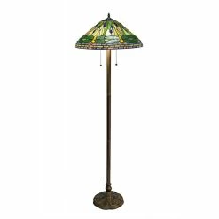This dramatic Tiffany-style Lamp has been handcrafted using stained glass wrapped in copper foil. The shade is highlighted by dragonfly motifs in tones of green and yellow with a green background. The shade has beautiful jeweled accents to compliment the design.