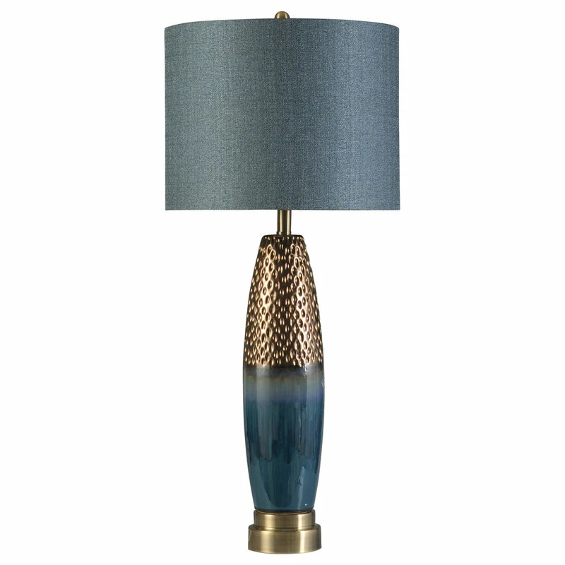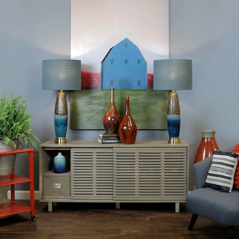 This striking ceramic and steel table lamp pairs a slim profile and rich, almost musical pairing of color and texture and tone with the simple rounded geometry of its hardback shade. It’s the perfect vintage-inspired modern touch for any home.