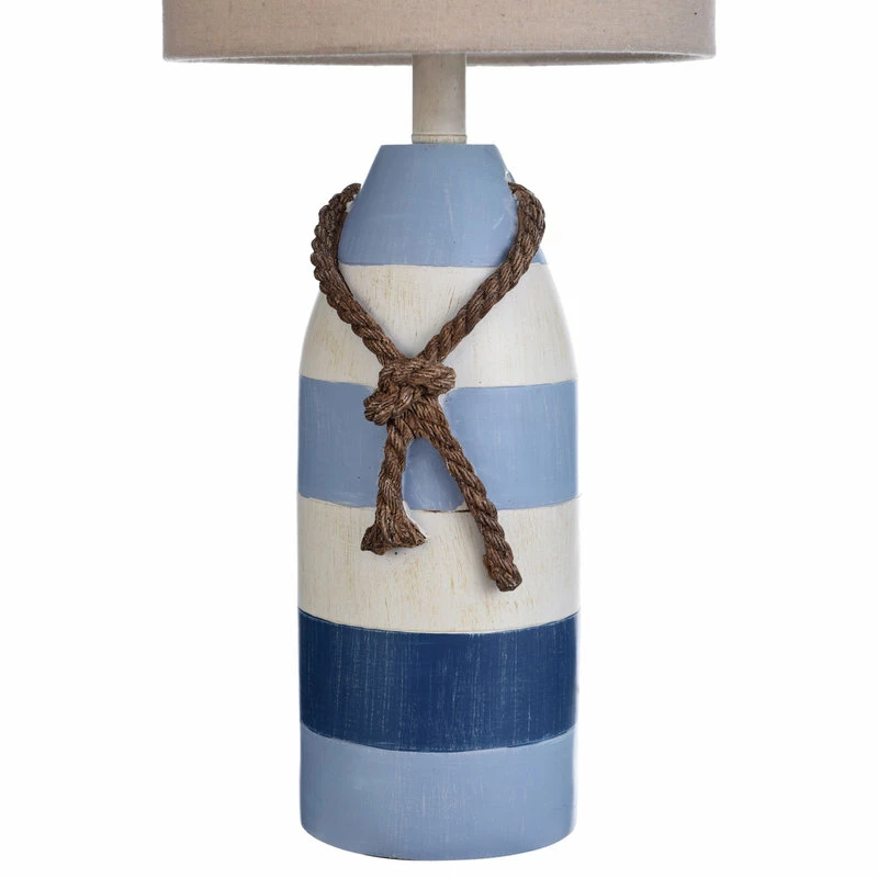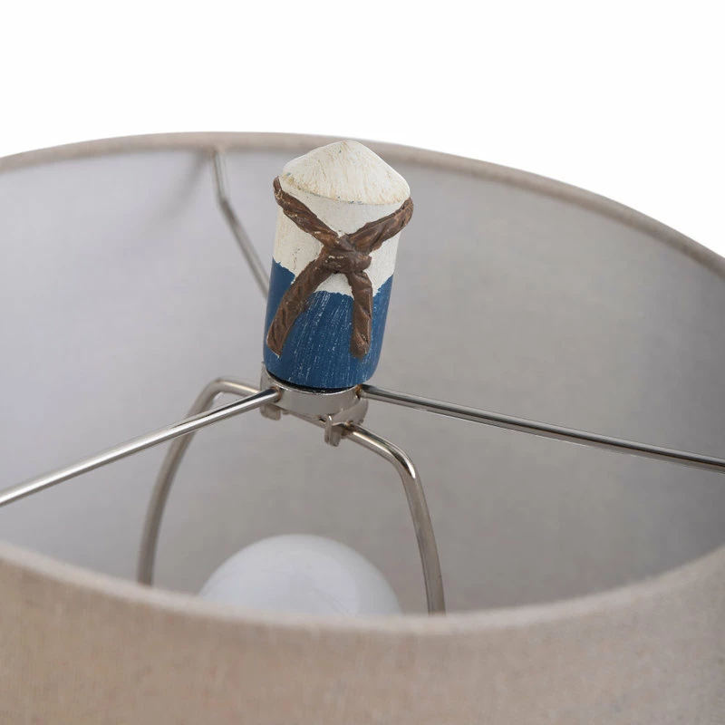 This coastal-inspired lamp has alternating white, light blue, and dark blue stripes and a brown rope accent. The hardback shade is made of oatmeal-colored fabric. This lamp’s nautical style is sure to be a charming addition to seaside decor in a bedroom, office, dining room, hallway, or living room.