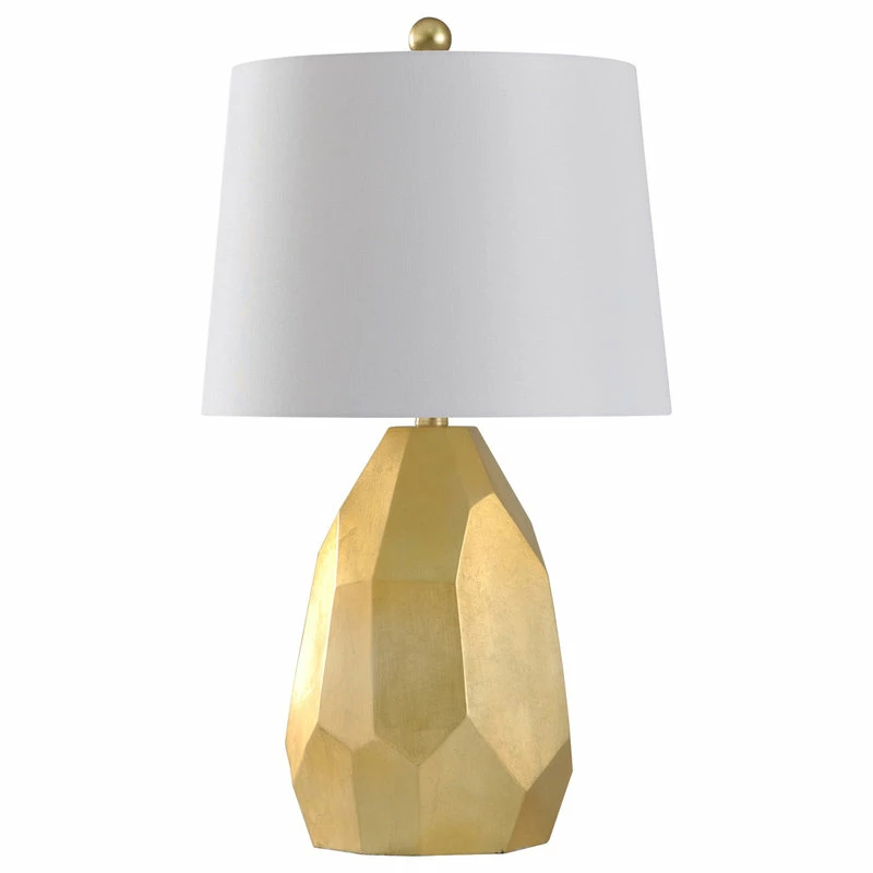 Thee are numerous characteristics of the Painted Gold table lamp to take note of. The poly resin body is adorned beautifully with a gold finish that features touches of distressed silver and faux cracks. It also includes a matching base and shade made from durable styrene you will love for years to come in your family room.