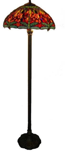 - Add an elegant touch to your home decor with this Tiffany-style floor lamp. This lamp features a dragonfly design and cabochon gemstone accents.